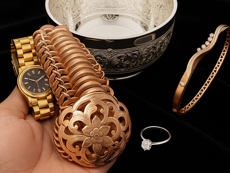 นอกจากทองคำ เรายังรับซื้อนาก ซึ่งเป็นโลหะสีชมพูทองที่นิยมในงานเครื่องประดับ รวมถึงโลหะมีค่าอื่นๆ เช่น เงินแท้ (Sterling Silver) แพลทินัม (Platinum) และ พาลาเดียม (Palladium)